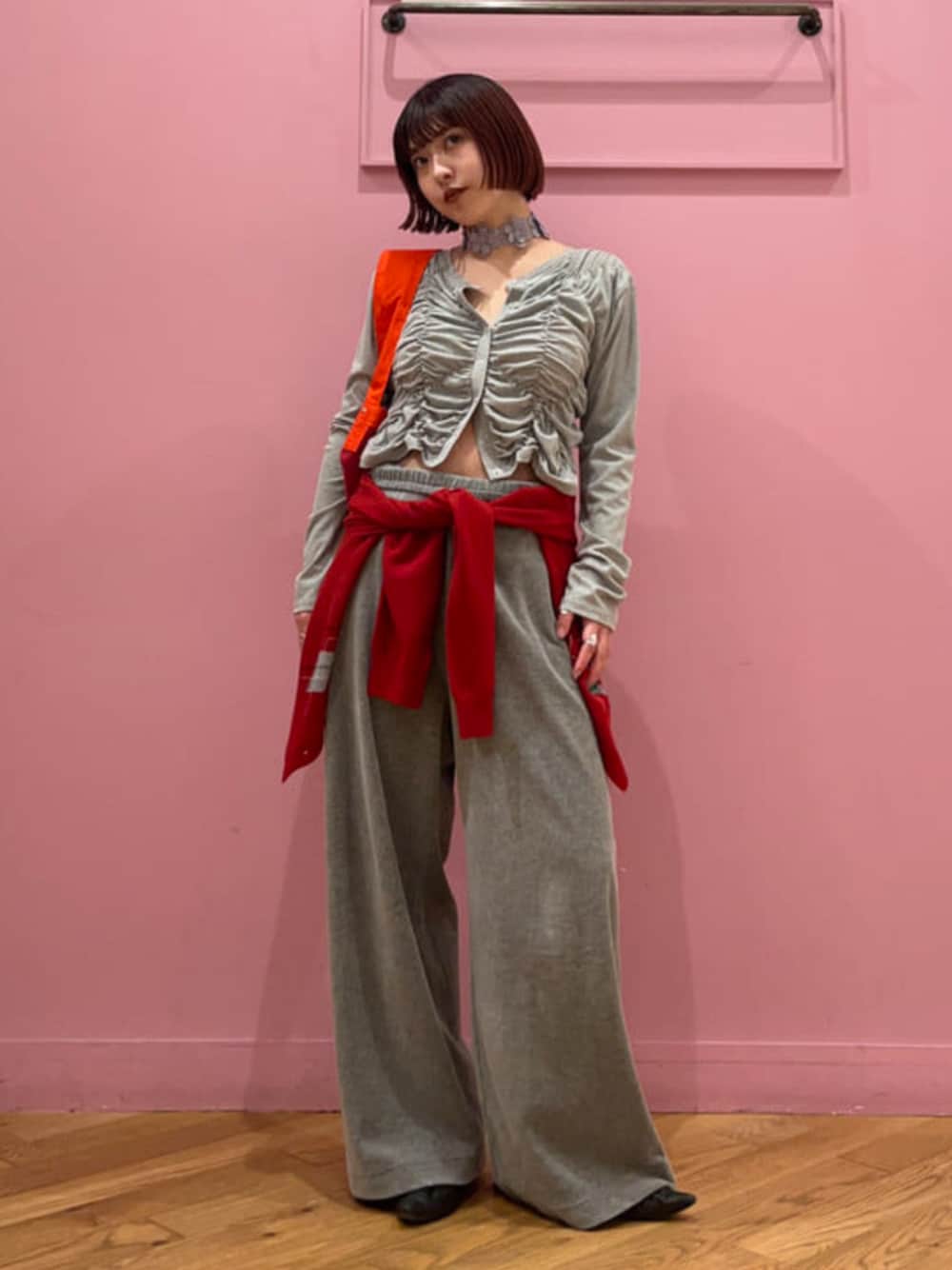 【155㎝/差し色としてもおすすめカーディガン】人気アーガイルカーディガンをあえて腰に巻いて、オールグレーコーデに差し色として取り入れてみました♪バッグも赤で合わせると一気に統一感がでてオシャレ感度もupしますよ! ビームス 大宮 / シオン