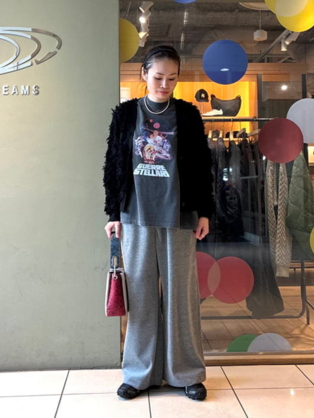 【リラックススタイル♪】〈GOOD ROCK SPEED〉のロングTシャツはフリーサイズで、STAR WARSのプリントです♪ベロアのスエットパンツはあったかいので、今の時期にオススメです!スタッフもリアルバイしている人が多く、お揃いの人がいっぱいいるのですが、色んなコーディネートがしやすいので、かぶってる感じはしないです(^ ^)私はサイズ1を着用したのですが、大きく感じたのでサイズは0にしようと思います。カーディガンはフリンジなので、さらっと羽織るだけでおしゃれに見えますよ〜。リラックスコーデでした! ビームス 町田 / 鈴木 亜美