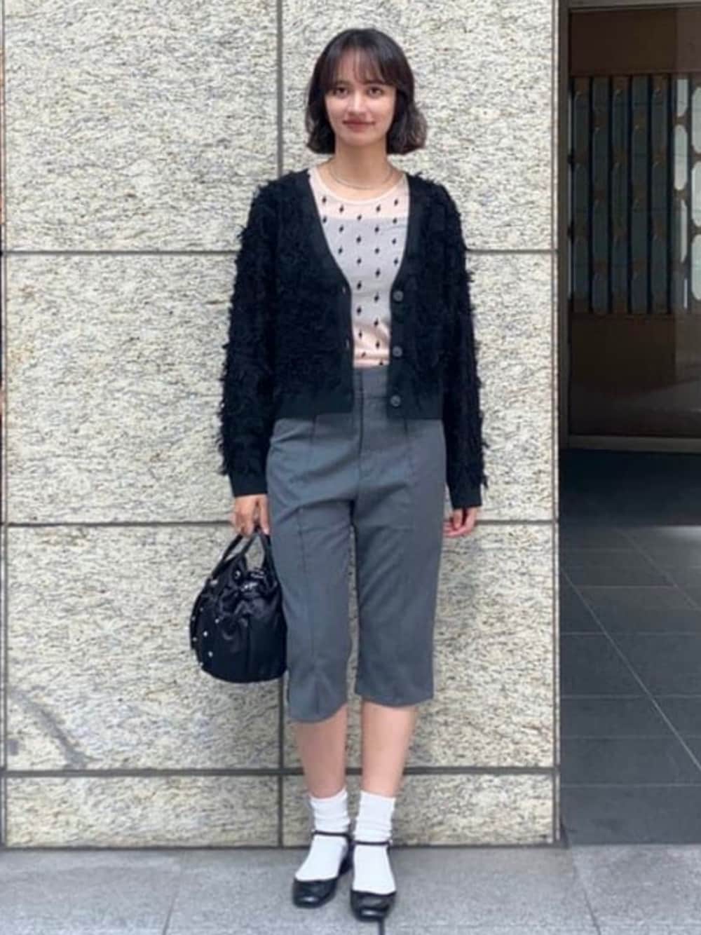 【168cm/カーディガンFREE/トップスFREE/パンツ1】カーディガンは大きめに開いたVネックがポイントになっているため、インナーも楽しめます♪オリジナル柄のシアートップスはヌーディーなカラーが女性らしくてオススメです◎ボトムスはお気に入りのカプリパンツを着用してレトロな雰囲気にしてみました❤︎ Ray BEAMS ビームス 梅田 / miyu
