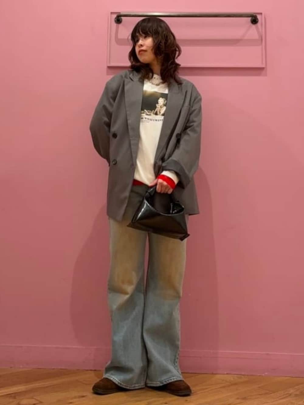 【160cm/ジャケット0、デニム26サイズ着用】私のだ〜い好きなジャケットスタイル。ジャージ×ジャケットやデニム×ジャケットまたは、スウェット×ジャケットなどカジュアルなアイテムにジャケットを合わせることが特に好きです♡ジャケットは万能アイテム何個あってもいいです。 今回は大きめな肩パット付きジャケットにインナーは大胆なプリントT。それと、形がどタイプすぎる〈Levi’s(リーバイス)〉のデニムと合わせました。こちらのデニムもすごい優秀で、少しフレアの形をしているのですが、そこまでフレア感が目立たず、元の脚が綺麗かのような演出をしてくれます☆太ももが大きめな160cmの私で26インチが太さも長さもジャスト!! ビームス 大宮 / リズ