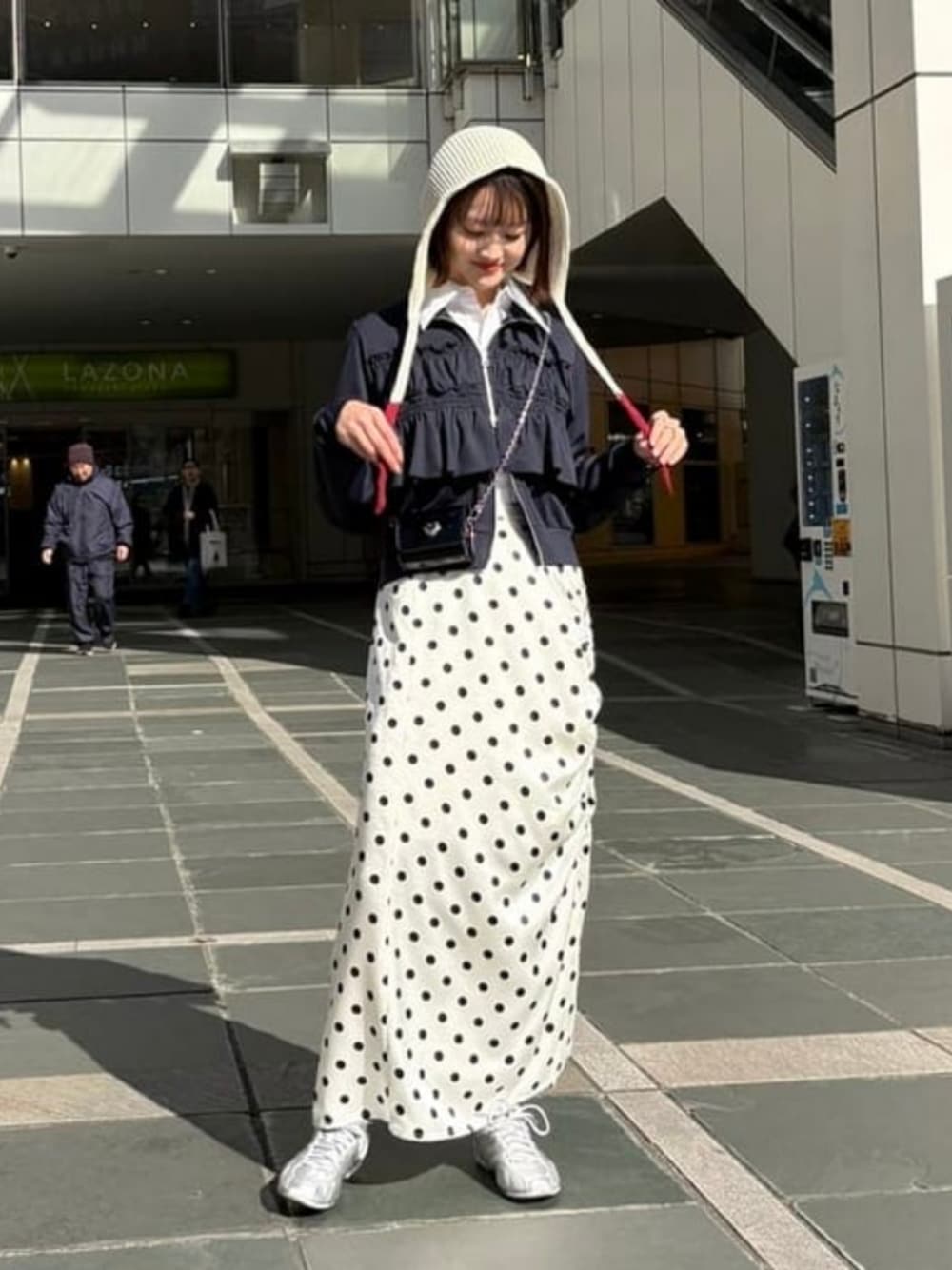 スポーティー×ガーリーコーデ! フリルジャージブルゾンは少し短めの着丈。ダブルチャックなので、レイヤードを楽しめます◎ ドット柄のサテンスカートは裏地付きで安心。タイトなシルエットとスリットが女性らしさをプラス! 【別注】bLicensceLLのチェーンポーチは リップやミニウォレットが入るサイズ感。コーデのアクセントにおすすめです◎ ビームス 川崎 / MAYU