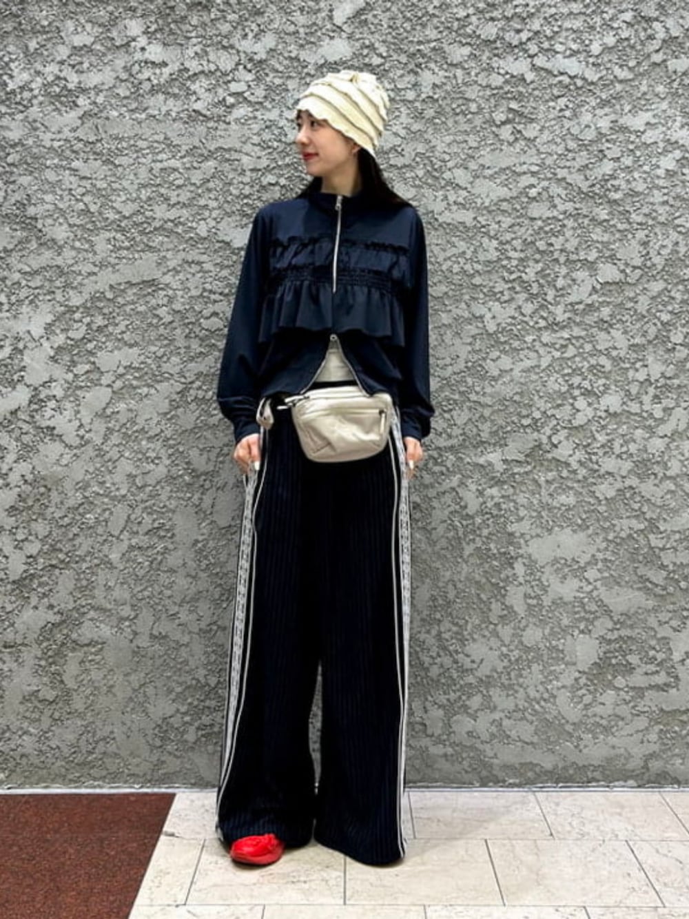 【26SS〈Ray BEAMS 〉のテーマは”Modern Romance”】 今回はフリル×レースで可愛いさとスポーティーさを掛け合わせてみました♥ 伸縮性のあるジャージはWzipでハイウエストのパンツとも合わせやすい!コンパクトなサイズ感なので夏にもぴったり!今時期から長く愛用していただけますよ〜 ネイビーをチョイスしたのがポイント◎ パンツはストライプ柄なので脚長効果抜群ですよ! ビームス 立川 / ササキ