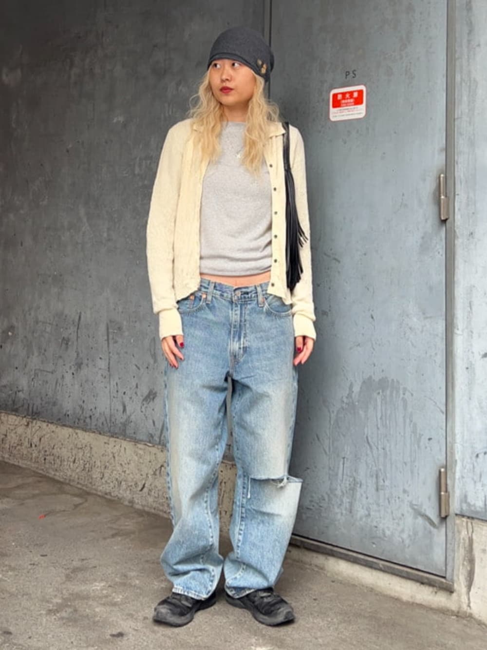 【ちょっぴり平成スタイル】今日はあったかかったので薄着なスタイリングに♩きになるシアーのリブカーディガンを羽織ってゆったりしつつも女の子っぽく。ボトムスはメンズのLEVI'S(R) / 578、バギージーンズ☆30インチ着用でベルトなし。ですがベルトがあるといいかも!今の気分はルーズにちょっとヘルシー! ビームス ストリート 梅田 / RUI