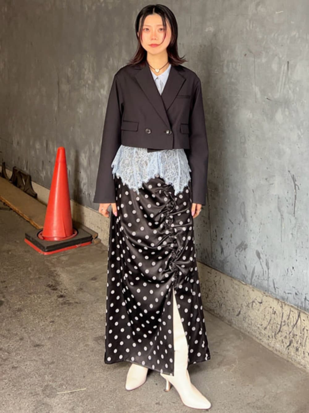 【ドット×レース】 トレンドのアイテムを組み合わせコーディネート!インナーのシャツは裾にレースがついており、レイヤードを楽しめちゃう1枚です☆スカートはサテン生地でスリットが入っており、動きやすさも◎でコーデに取り入れやすい! Ray BEAMS / アカリ