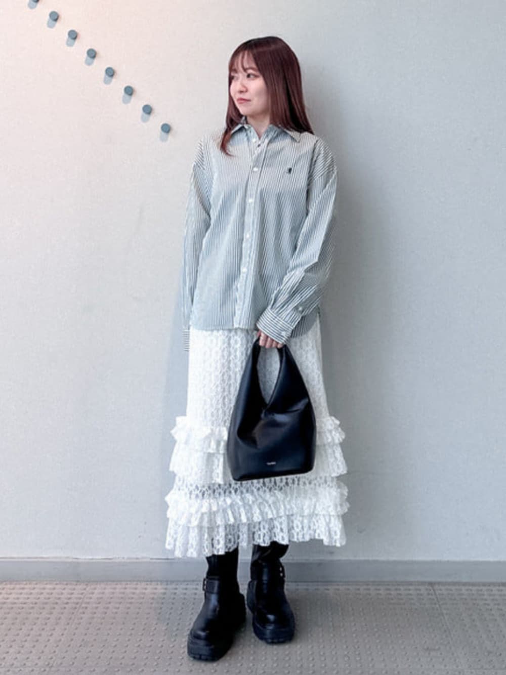 【春の王道!ストライプシャツ♡】春にはストライプしゃつはマストアイテム!Gymphlexのマークがアクセントになって可愛いアイテムです♪レースのスカートと合わせて春全開コーデにしました♪ ビームス 名古屋 / フジサワ