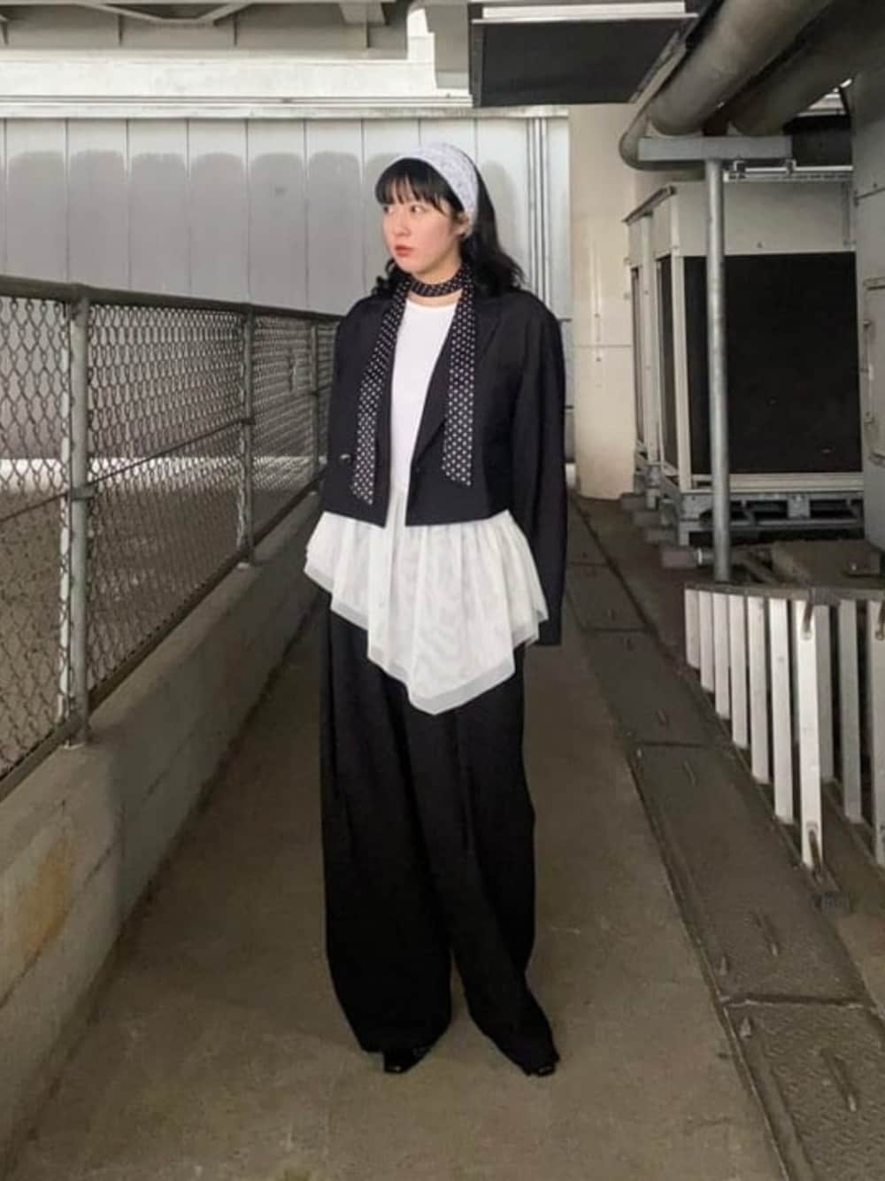 モノトーンでカッコよく、アシンメトリーのチュールで女の子っぽさとレースのヘアバンドで今っぽさの欲張りコーディネートです。 ビームス 北千住 / 晶