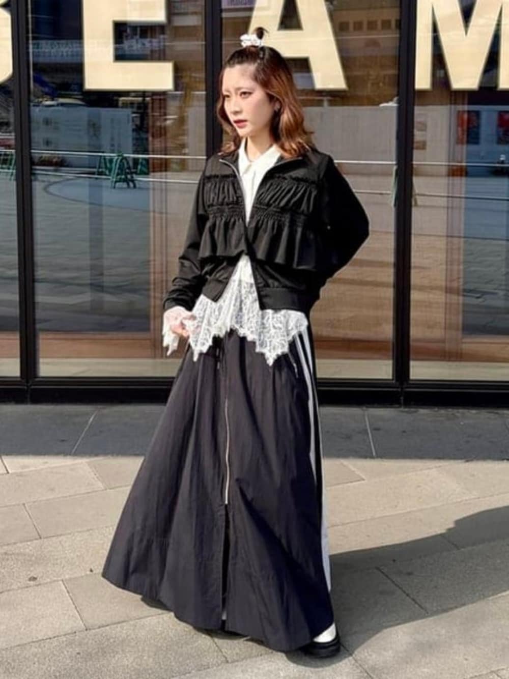 切り返しの部分がレースで施されてガーリーかつ綺麗なシルエットなトップスです!合わせたのは人気のフリルジャージ!ダブルジップのためスッキリした印象にも見せてくれます! ビームス 長崎 / 山口 桜良
