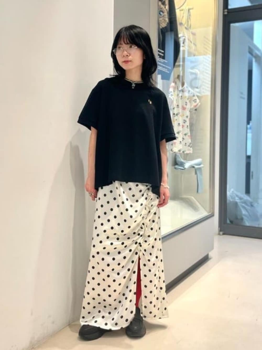 【トレンドの柄を取り入れて、旬顔バランス】【162cm/イエベ春/骨格ウェーブ/普段サイズS】ドッド柄が再熱してますね♡そのままレトロ・ガーリーに着るのも可愛いですが、ちょっぴりモードに合わせるのが旬なスタイル。今回はレザーを合わせてエッジを効かせました。〈Ray BEAMS〉のフェイクレザーブルゾンは、柔らかな質感と光沢感が上品な一着。春物とも合わせやすい、重く見えないショート丈。ボリュームのあるボトムスと合わせても、すっきりまとまります!●サイズ●サイズ1を着用。肩幅・身幅ともにゆったり、着丈は腰くらい。たくさん着込んだり、メンズライクな雰囲気がお好きでしたらこのサイズがオススメ◎毎シーズン大人気な〈FRED PERRY〉別注のTシャツをインナーに。アウターの下でも衿リブのラインが映えます!汗ばんでも肌離れが良く、通気性にも優れた鹿の子素材を使用。透け感がでにくい生地感も◎●サイズ●ワンサイズですが、全体的にオーバーサイズ、腰回りをカバーしてくれる前後差がある長さが嬉しい♩サテン地のドット柄スカートは、アシンメトリーなギャザーが可愛い!スリットが深めなので、カラーソックスを魅せてポイントに。●サイズ●サイズ0を着用。ウエストはゴムでストレスフリー、着丈は長めで足首くらい。タイトすぎないシルエットで、見た目より足捌きもしやすいです。バッグはホワイトを選んで、全体の春らしい軽さを意識しました♩ ビームス みなとみらい / デグチ アツミ