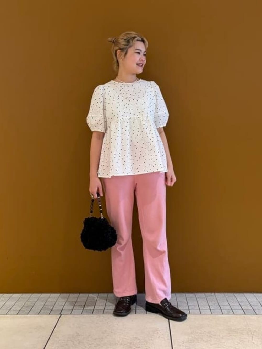 【ブラウス1枚で着回し抜群です!】こちらのドット柄のブラウスを持っていると、デニム、トレンドのスウェットパンツ、少し綺麗めなスラックスなどを合わせて沢山着回しができますね❤︎もちろん、スカートも素敵です☺︎骨格ストレートの私は、肩の切り替えや、ウエスト高めの切り替えでメリハリをつけてスッキリ見えしました!! ビームス 武蔵小杉 / ayu