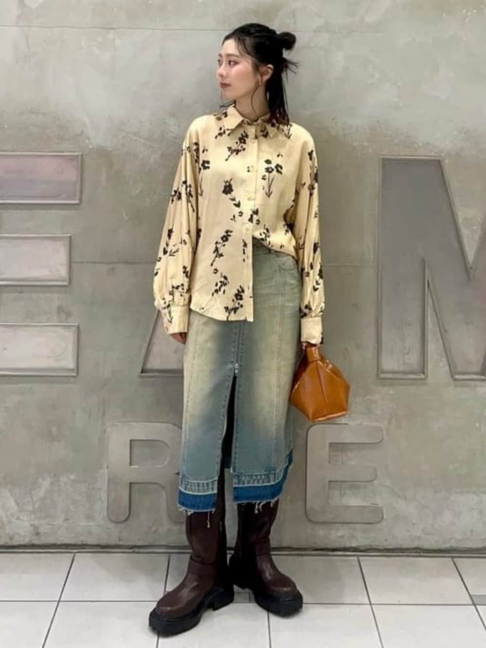 【シャツ×デニム】 〈GHOSPELL〉の柄シャツにデニムスカートを合わせてカジュアルなスタイリングに!!スカートはフロントにZIPでスリットが入っており、調節可能です。サイズは小さい方の0を着用!! ビームス 天王寺 / アカリ