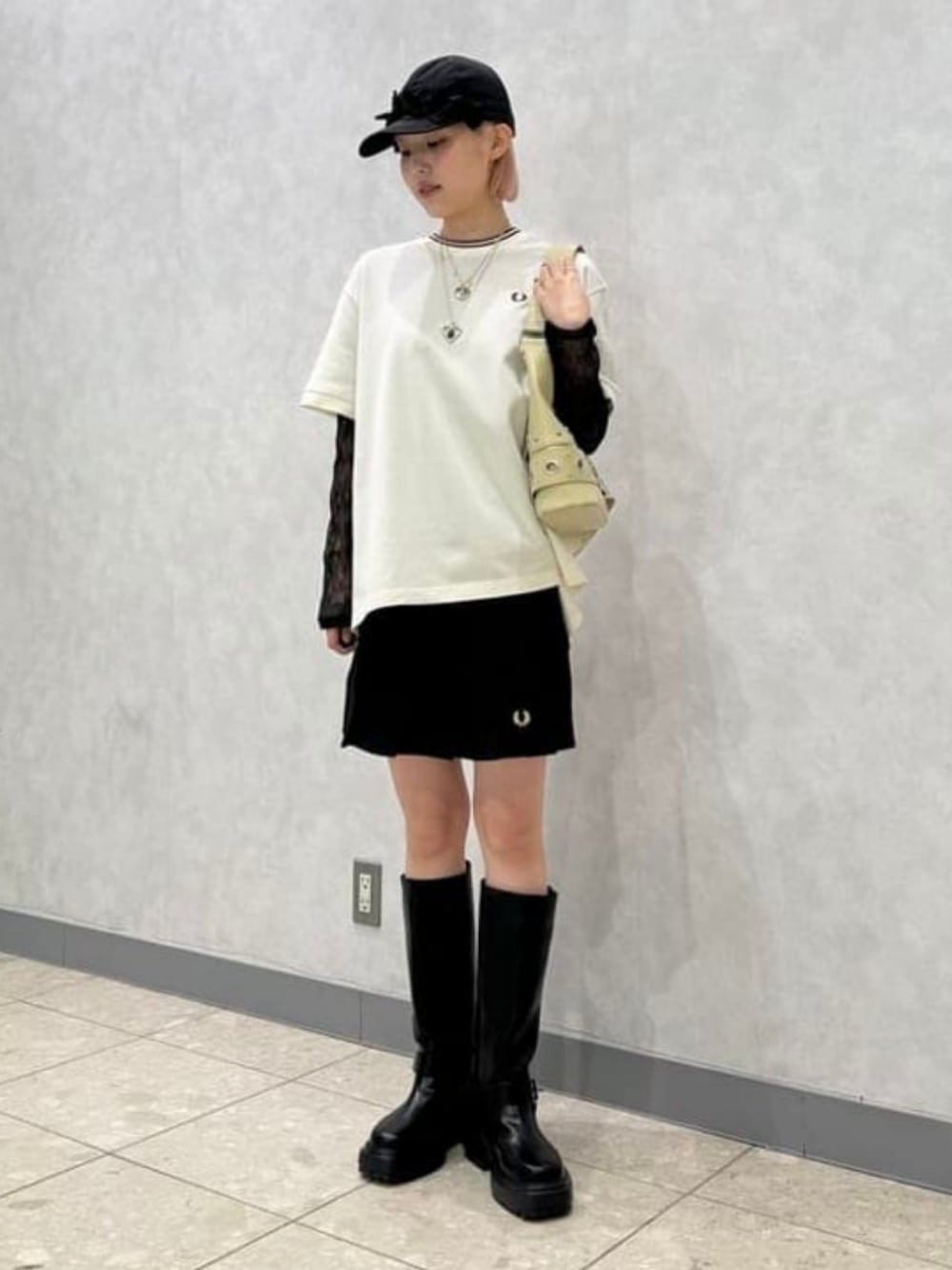 【FRED PERRY】26SS続々と入荷しております♡その中でもイチオシアイテムたちでコーディネートしてみました♩Tシャツはかなりゆとりのあるサイズ感だったのでボトムスはコンパクトなショーツを。プリーツスカートのように見えて実はショーツなんです!(◜ᴗ◝ )中にレースのTシャツを仕込むことで大人っぽさもプラス。足元もブラックでまとめてみました!ネックレスは二連でつけて遊び心も♡ ビームス 鹿児島 / 泥谷 菜々子