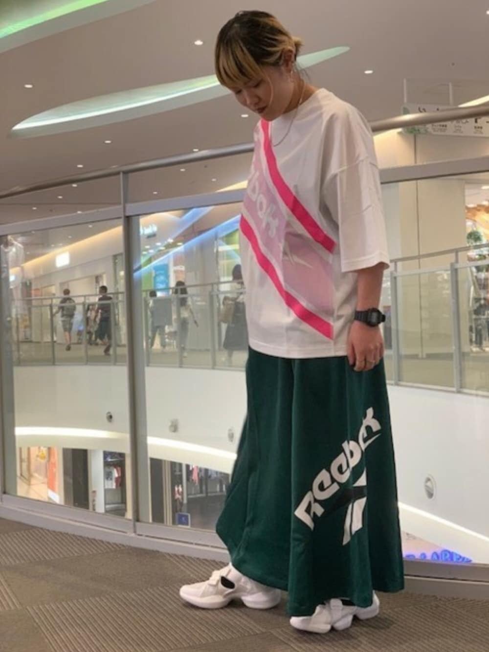 スタッフコーディネート|女性|リーボッククラシックストア ダイバーシティ東京 プラザ BEAUTY&YOUTHとのコラボレーションアイテムを使ったコーディネートです。 スカートもTシャツもゆったりしていて、とても着やすいです。 春らしいカラーリングでまとめました!