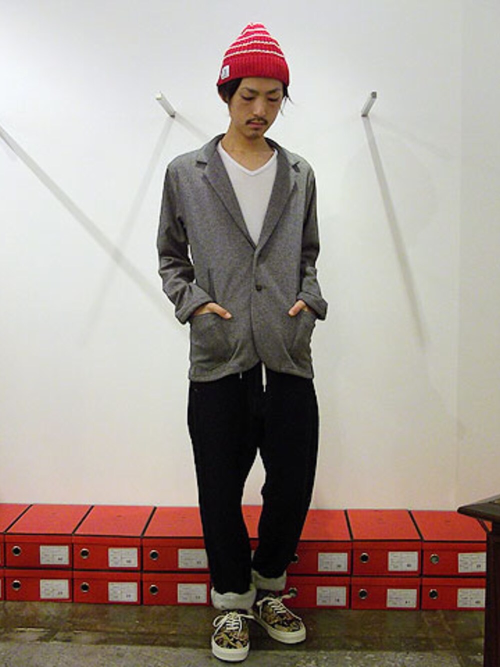 キレイな印象のテーラードジャケットにイージーパンツライクなウールパンツを合わせてカジュアルダウンさせたコーディネート。 シンプルなアイテム構成に、柄物のニットキャップとシューズをアクセントにしています。