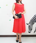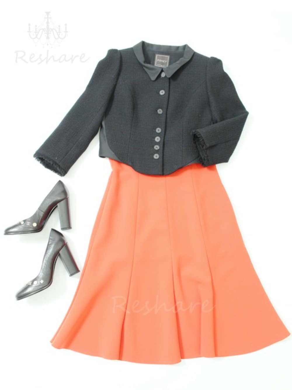 ワンピース:ルネ/ドレスワンピースストレッチ レッドオレンジ ジャケット:フォクシー/コルティ ブラック 靴:シャネル