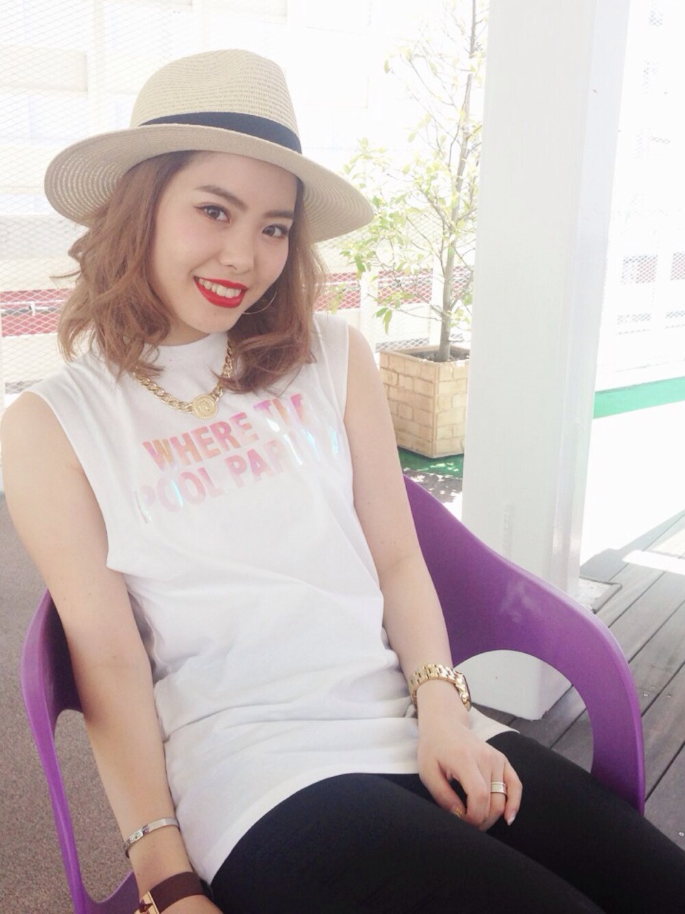 ホワイト系のTシャツ/カットソーを着用したレディースの夏コーディネートの1枚目の写真