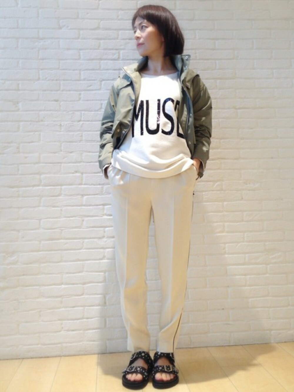マウンテンパーカ×ロゴスウェット×ラインパンツ×スポーツサンダルのアウトドアなスポーツMIXスタイルが気分。 光沢のあるサテン素材(パンツ)と、トレンドのカーキ(アウター)を取り入れて、ワンランク上の大人のスタイルに。