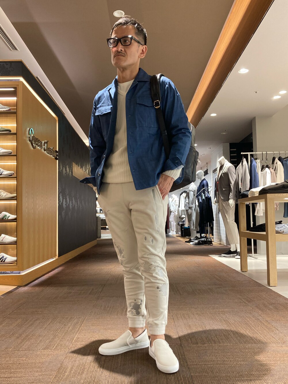 171cm/63k 通常着用サイズ↓↓↓ ウェア 44/30㌅/S 靴 42/26.5cm/甲高/width(ウィズ幅)E インパクトあるパンツをこなすにはカラーで統一と相性よろしなカラーを挿すとまとまりが出ます。ここではホワイトカラーで統一してブルーを挿す。 爽やかですね。