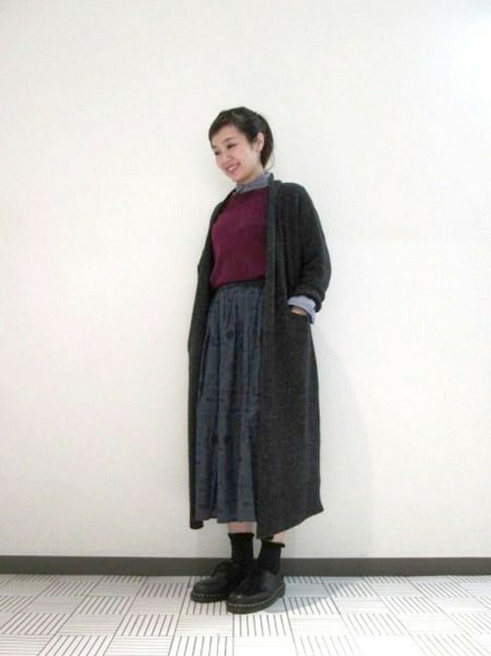 【studio CLIP スタッフスタイリング】 ボルドーのニットとブルーグレーの珍しいカラーのシャツを合わせて トラッドなスタイリングにしました。 個性的でありつつ落ち着いたカラーでまとめることで より秋らしい深みのある印象にしました。 幼くならないようにロングカーディガンで女性らしさをプラスしています。