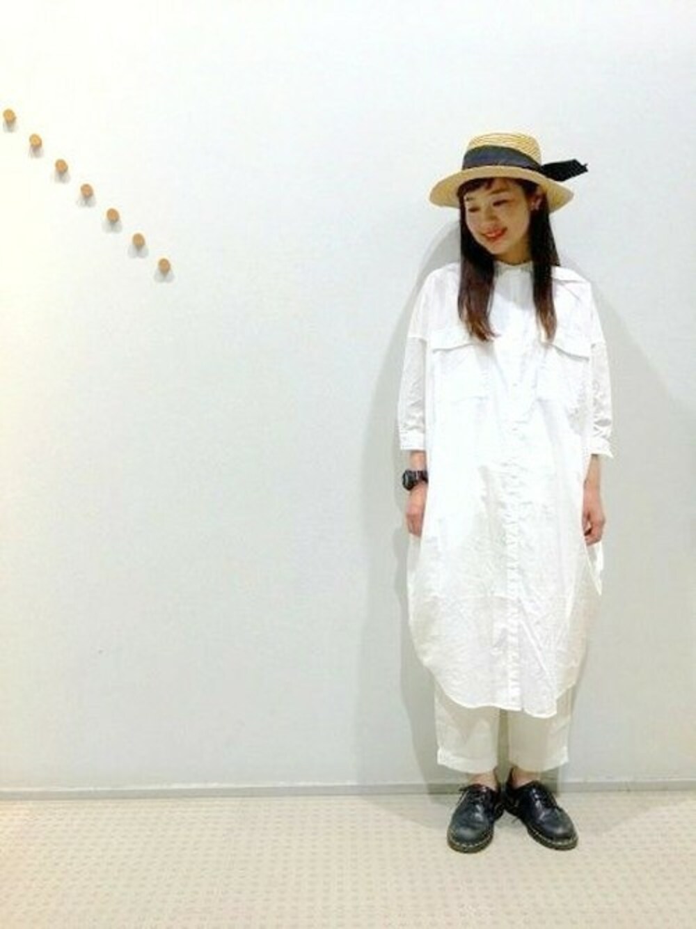 大人めなナチュラルスタイルにしました。 ゆったりとしたシルエットにボンタンパンツを合わせているので ホワイトでもスッキリとした印象になりますよ。 部分的にブラックで引き締めるのがポイントです。 ベーシックなアイテムでいろんな着こなしの発見をしてみてください☆