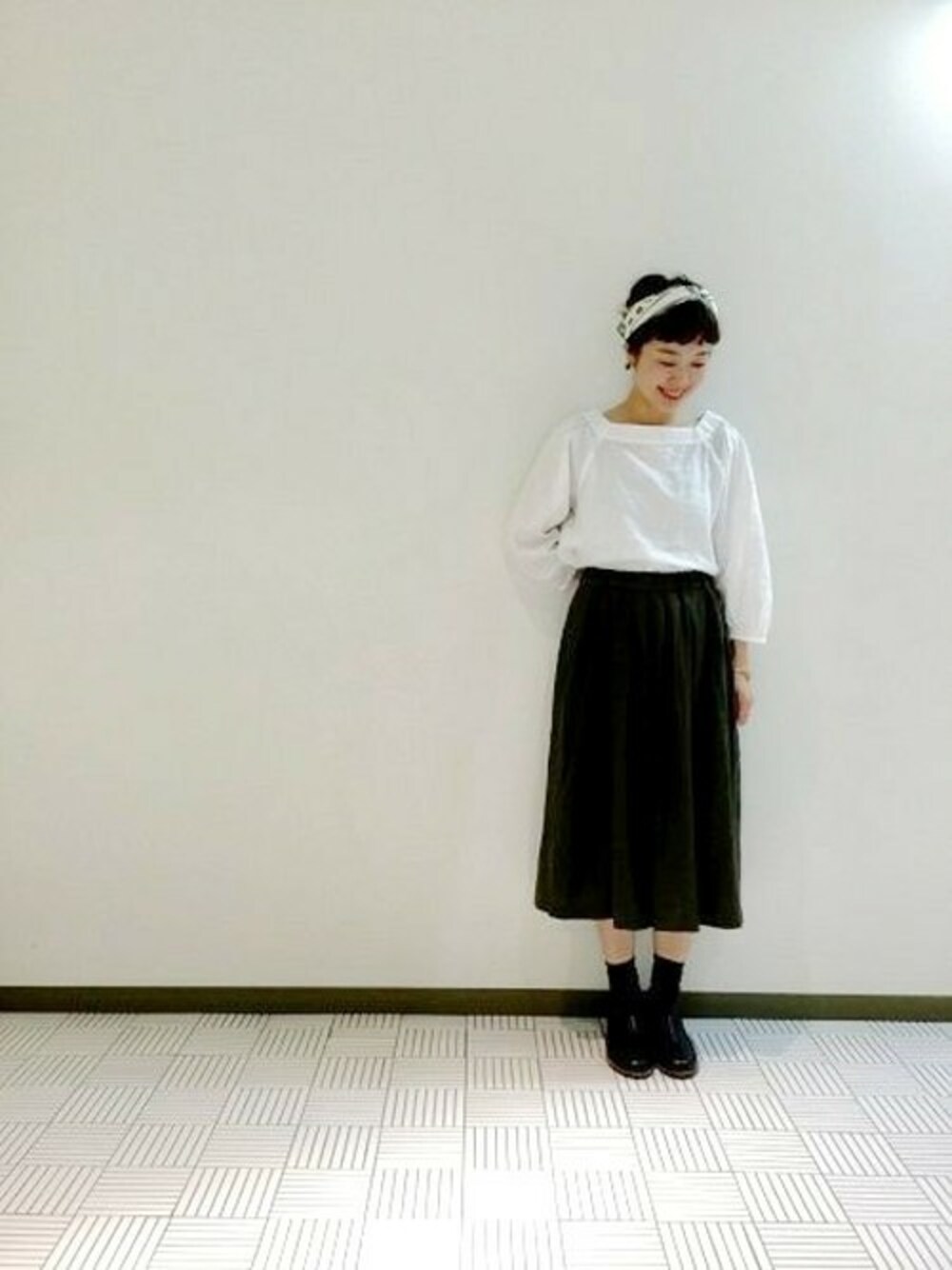 daysのミモレスカーチョでコーディネートしました。 アルガンオイル配合柔軟仕上げ剤で洗いがかけてあるので 麻レーヨンのとろみ感がさらに優しい風合いになっています。 もちろん着心地もよく、女性らしいスタイリングだけでなく カジュアルにもぴったりです。 少し秋色を差し込んで、これからの季節を楽しんでくださいね。