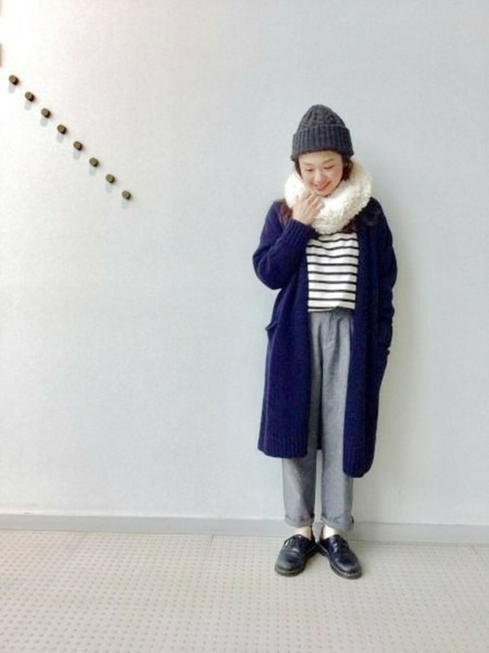 新作のニットガウンでコーディネートしました。 重みのあるコートが苦手な方にはこの時期にとてもおすすめです。 しっかりとしたウールのバランスが着ていて心地よいニットです。 ベーシックカラーでどんなスタイリングにも相性のいいアイテムです。