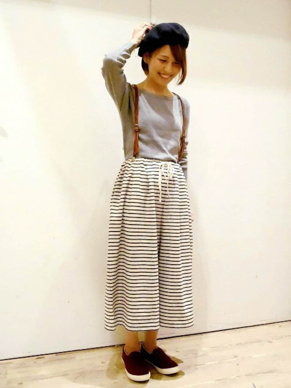 こんばんは☆羽生店スタッフです。 WEAR久々に更新です。 ワイドパンツがゆったりしているので、細身のニットを合わせてスッキリと大人っぽい印象にしました! 小物に、レザーのサスペンダーとファー付のベレー帽を合わせて秋らしく♪足元にボルドーのスリッポンで色味をプラスしました。