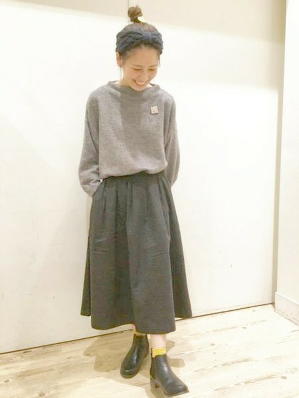 アルパカ混のプルオーバーは軽くて柔らかく、肌あたりも良いのでとても着やすいです。スカートもグレーで統一感を出し、 サイドゴアのブーツも黒で締めて大人っぽい印象にしました。