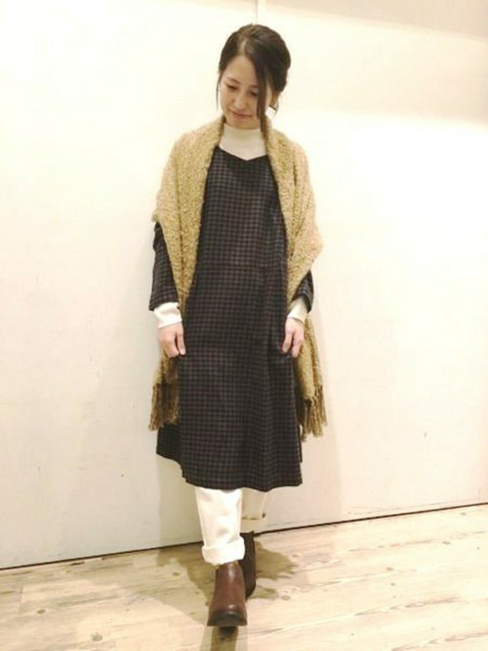 ナチュラルなワンピースにリブのインナーを入れて大人っぽくしました。 ワンピースはサイドのゴムが可愛いので、アウターは着ずにストールを羽織って色味もプラスしました。