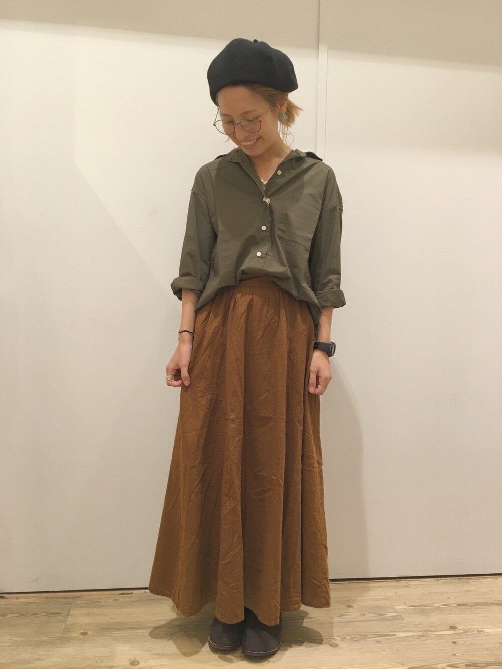 こんばんは🌜 いつも、いいねやフォローありがとうございます🙇 台風の影響が出ていますね。 明日も続くようなので、皆様お気をつけください。。 カーキのシャツにテラコッタのスカートを合わせて、カラーから秋!!🍁 シャツはボタンをひとつあけて スッキリした印象で着るのがオススメです(^ω^) 最近は毎日ベレー帽にお世話になっております🎩