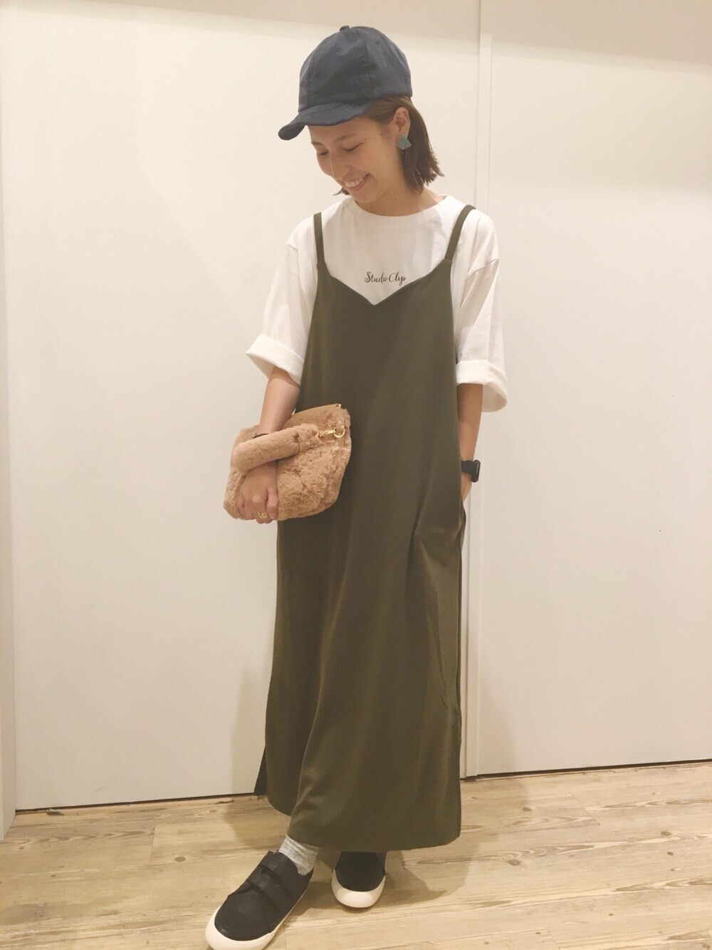 こんにちは! studioCLIPロゴTシャツに合わせたコーディネートです👕 カット素材のキャミワンピで今年らしくしました🌟 こちらのワンピースは、TシャツとのSET商品なのですが、今回はロゴTと合わせました!