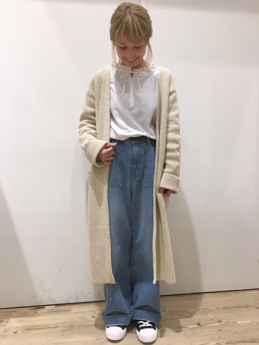 こんにちは🌞 新しく入荷した、daysシリーズのカーディガンを使ったコーディネートです💓 ワッフル生地の春らしい素材感が、たまらなく可愛くて即決で購入しました👚 襟のフリルが可愛いブラウスは、すでにお店でもとても人気なのでお早めに!!🏃💨