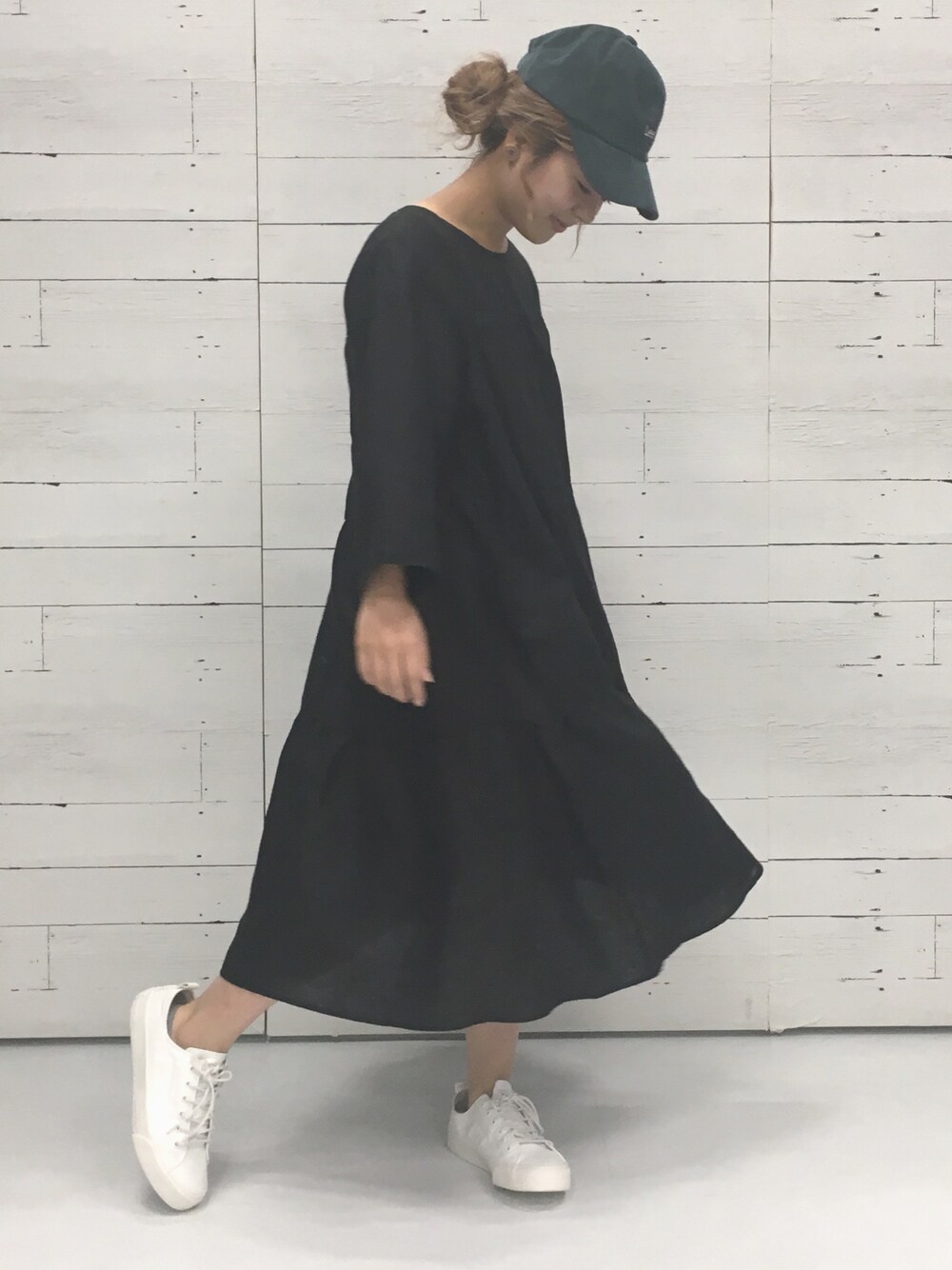 大人可愛いティアードワンピ👗💓 リネン素材がナチュラルな雰囲気にも😆 キャップとスニーカーでカジュアルにしてみました✨