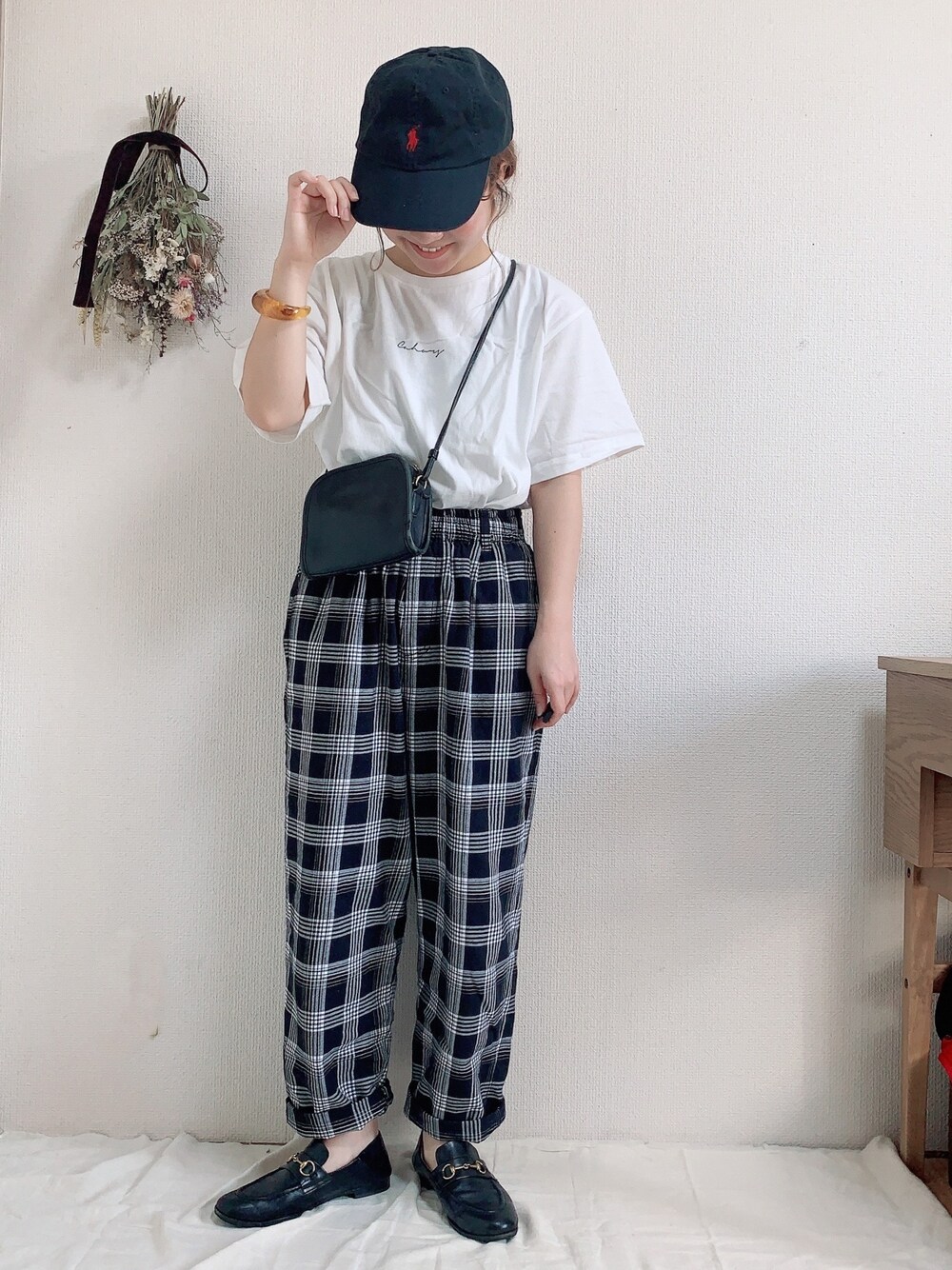 ゆったり楽ちんのマルシェパンツを使った、ちょっとそこまでコーデ◯ チェックパンツは、レザー小物で合わせるとパジャマっぽくならずに着れるのでオススメです! ウエストに内紐付きなので調整も可能。 二回ロールアップしています。