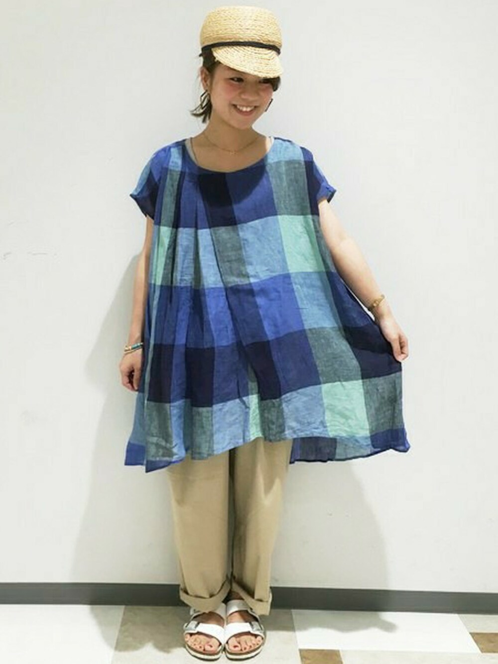 studio CLIP saito(studio CLIP 本部)のチュニック「コットンリネンビッグチェックタックチュニック」を使ったコーディネート