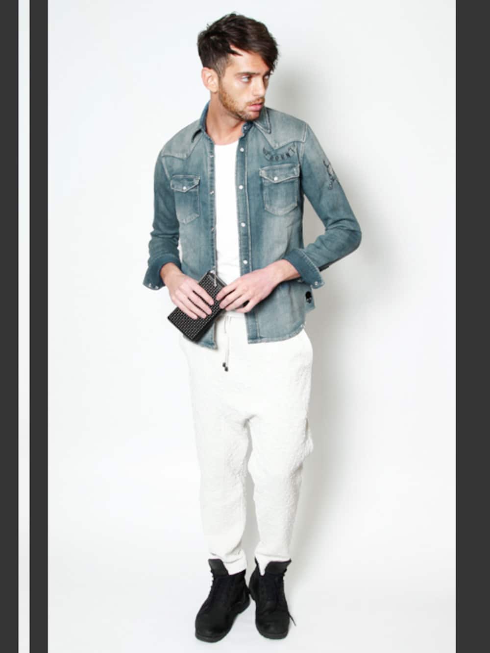 ダメージや色落ちの加工をふんだんに加えたヴィンテージライクなデニムシャツは、 胸元や、裾、背中にいたるまで360度ディテールにこだわったデザイン。 刺繍・抜染・ラインストーンで描かれたブランドアイコンであるスカルがポイント。 細身のシルエットながら、裏毛素材を使用した生地で動きやすく抜群の着心地。 オープンスタイルで前ボタンを開けて、腕をまくって折り返すとよりバランスも良い着こなしに。 ボトムスはボリューム感のあるTOM REBLのテクスチャーリラックスパンツを合わせて、モードスタイルに。 明るく清潔感のあるホワイトをメインにしたコーディネートは、女性ウケも抜群のモテスタイル。 小物は、Roenの上質なレザーに丁寧に打ち込み処理されたスタッズがハードかつラグジュアリーなデザインのラウンドジップウォレット。 引き手には存在感のある精巧なスカルチャーム付です。