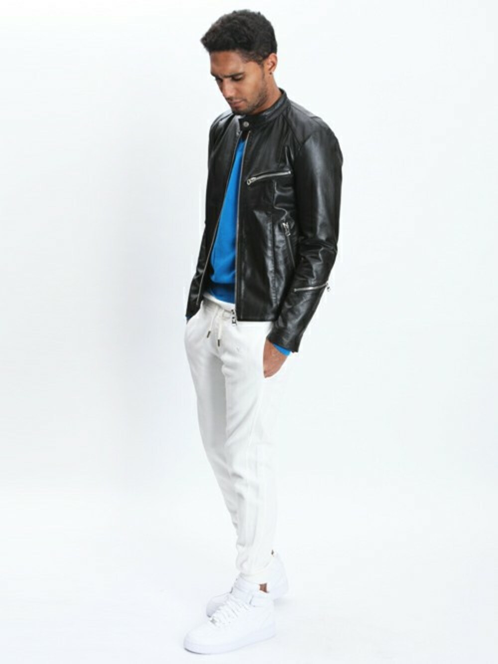 ホワイト×ブルーのカラーリングをブラックのジャケットで引き締め、重くなりがちな秋冬コーデをクリーンな印象に。 上質素材を利用したライダースは軽やかでありながら暖かく、真冬はコートのインにもおすすめです。