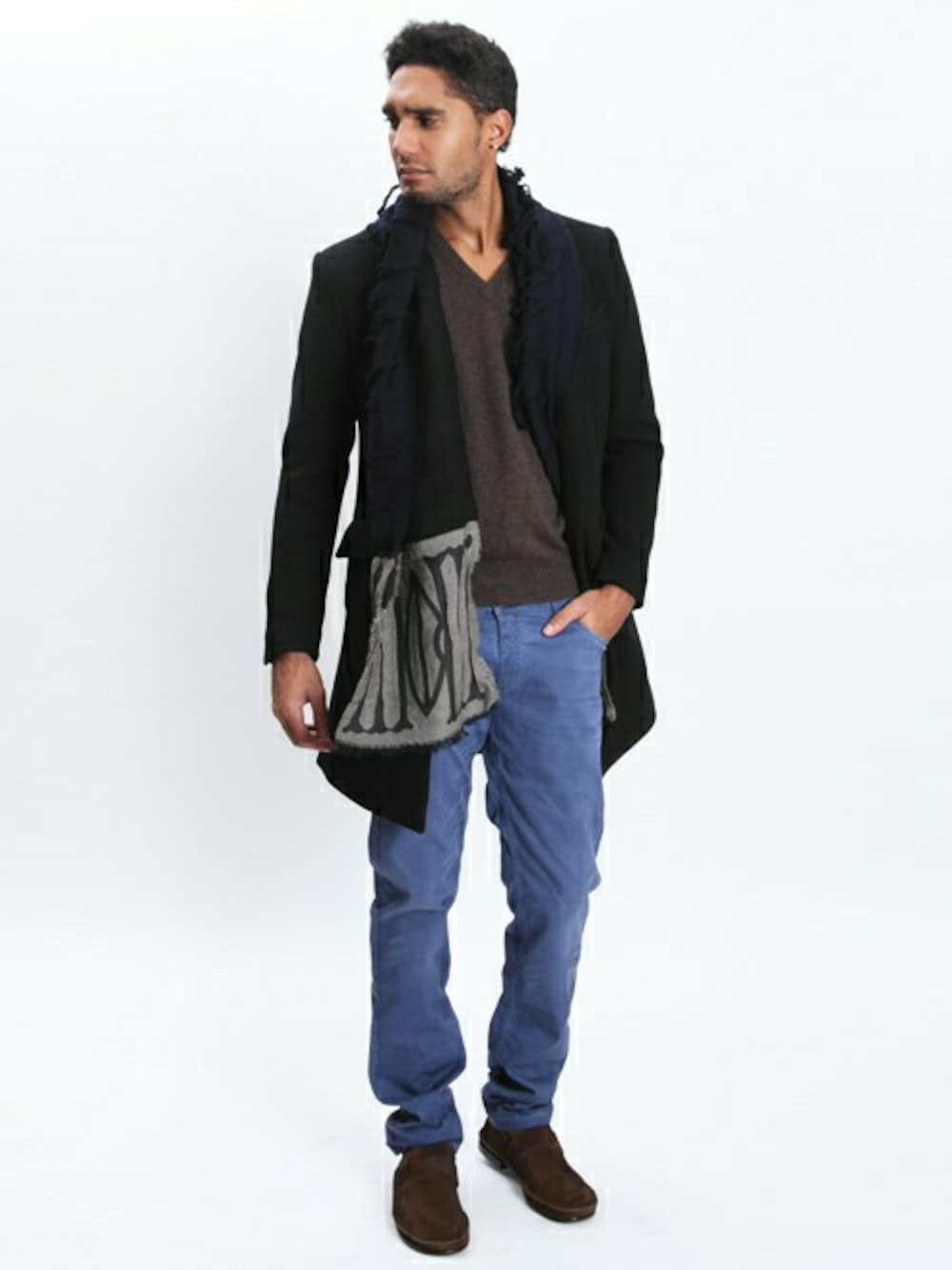 個性のある巻物を合わせてフォーマルになりがちなチェスターコートをカジュアルダウンしこなれた印象に。 両端にブランドアイコンであるリップマークがデザインされたロングサイズのストールはイタリアの有名セレクトでも人気の高いTOM REBLのもの。