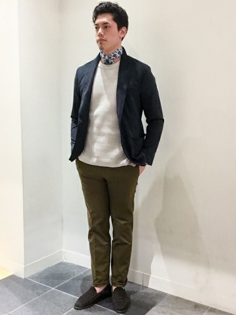 岡﨑のチノパンツ「SD: 【ストレッチ】 コットン ドレスチノパンツ (オリーブ)」を使ったコーディネート