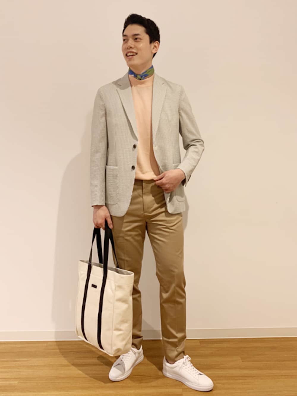セットアップでもご用意しているシアサッカー生地のジャケットに今期トレンドカラーのピンクモックネックで休日スタイルを演出! 春を先取るアイテムなのでオススメです!