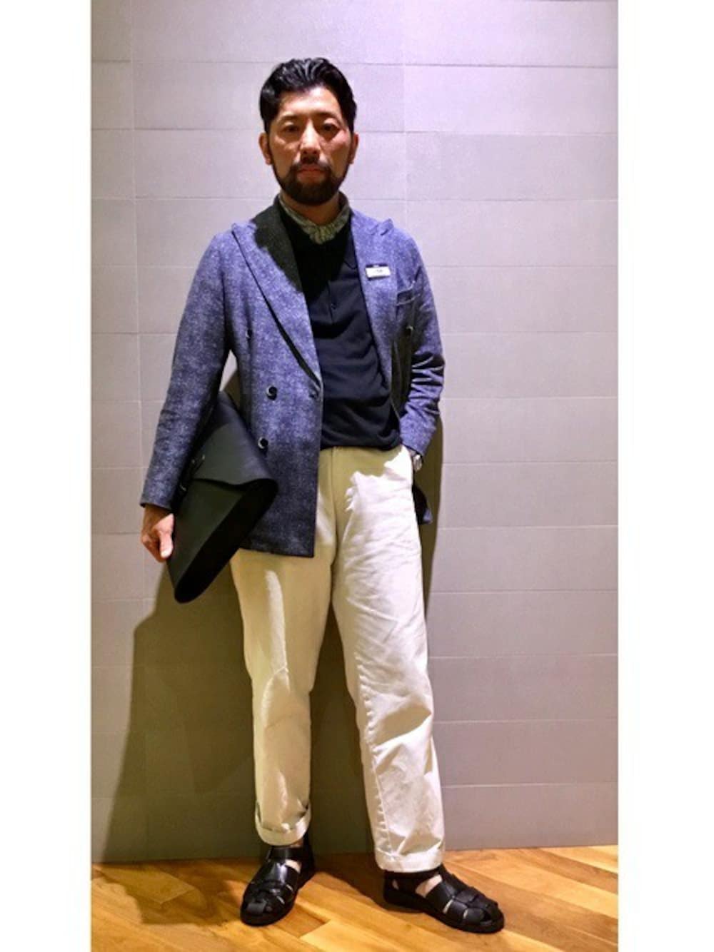 チルコロのダブルのジャケットにジョンスメドレーのポロシャツを合わせたコーディネートにBOLDRINIのクラッチバッグをチョイス。