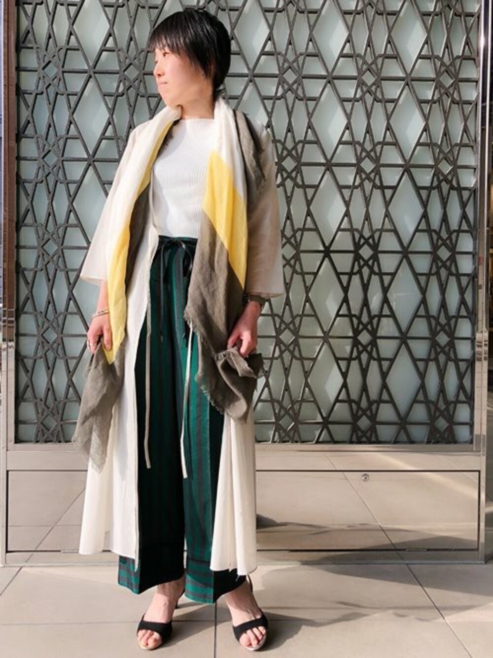 カシュクールタイプのワンピースを羽織りとしてパンツスタイルに合わせました。ストールをプラスして華やかに。
