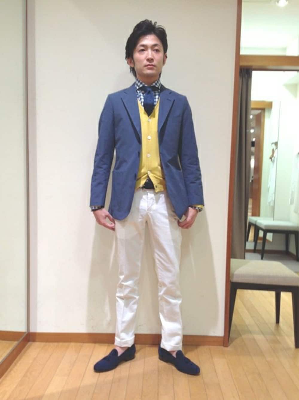 春です。冬物をクローゼットへしまう季節がやってきました。そこでこれからお勧めするジャケットですが、スタッフが着用しているジャケットは綿麻素材につき、夏も着て頂けます。また、共地パンツも有りますから、上下合わせてスーツとしても着て頂けますよ。 画像で着用しているパンツも同様に綿麻素材で、今年も白パンは人気の兆しで、バリエーションも豊富です。そして今年のさし色として大注目なのがマスタードカラーです。画像ではマスタードカラーのベストを着用していますが、その他にもパンツやブルゾン、ポロシャツ等もご用意しておりますから、是非共お店へご来店頂き、チェックしてください。