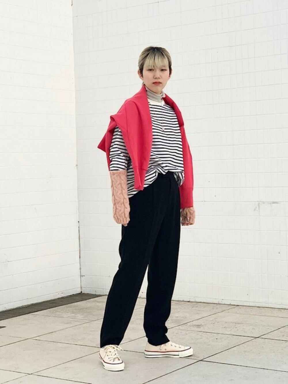 ピンクをアクセントにしたフレンチスタイル 身長:161cm / 普段サイズ:36 ◆ロンT 312-06-0065-1999 着用サイズ : ONE SIZE 【サイズ感】 ゆったりめのサイズ感で丈感長めです。 【素材感・着心地】 サラッとしていて肌触り良く着ていただけます。 ◆カーディガン 312-26-0010-3299 着用サイズ : ONE SIZE 【サイズ感】 身幅ゆったりめで丈感は長すぎずコンパクトに着れます。 【素材感・着心地】 肉厚でしっかりとした生地感。体温調節にぴったりです。 ◆パンツ 313-16-0119-1936 着用サイズ:36 【サイズ感】 すっきり見えするシルエットですが身体のライン気になりづらいです。 【素材感・着心地】 裏地付きで安心感がありサラッとしていて着心地良いです。