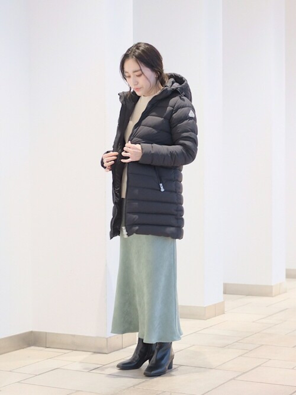 【着用レビュー】 身長:158cm / 普段サイズ:S 着用アイテム:ダウンコート 着用サイズ:36 サイズ感:表地にはソフトでストレッチ性もあるポリエステル素材で、ストレスを感じない軽快な着心地 素材感・着心地:PRENEXのスポーツモデルを代表するスプートニック。細めのピッチでキルトステッチを全面に施してシャープに仕上げたフーデットコート、フードは取り外しが可能。 着用アイテム:ニットコンビシャツ 着用サイズ:ONE SIZE サイズ感:全体的にゆとりのある裾広がりのAラインシルエット 素材感・着心地:一枚でトレンドのレイヤードスタイリングが楽しめます。シャツ部分は椿オイル加工を施ししなやかな光沢感がでるシャツ地を使用し、対するニット部分は毛羽立ちを抑えたサラッとドライタッチでふくらみのある糸を使用。 着用アイテム:スカート 着用サイズ:36 サイズ感:腰回りにフィット感あり 素材感・着心地:ウエストゴム仕様ですっきりとしたロングシルエット。長い毛足とリアルな質感のフェイクスエードは、程よい光沢感と質感で冬素材との相性が良いのもポイント。ご自宅で洗えます!