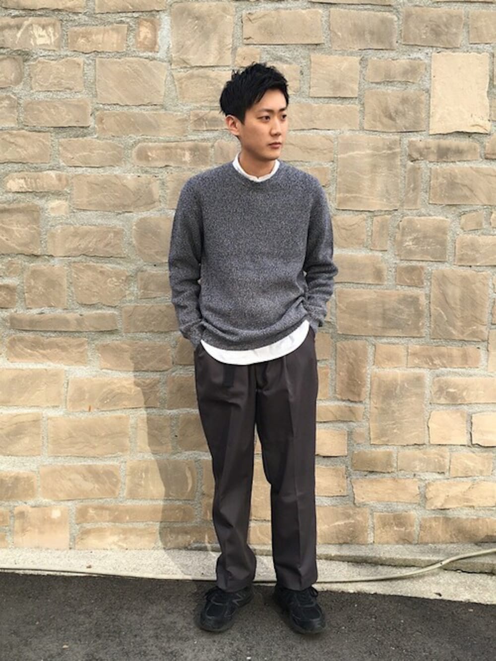 桑畑のニット/セーター「SHIPS:【抗菌・洗える】ミックスヤーン 畔編み クルーネック プルオーバー」を使ったコーディネート