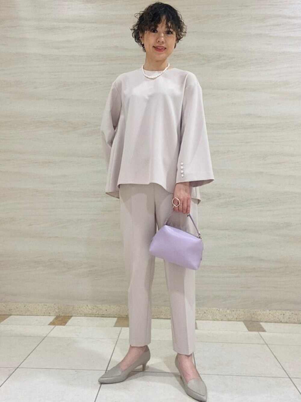 西澤のシャツ/ブラウス「〈手洗い可能〉パールモチーフボタンクルーネックブラウス◆」を使ったコーディネート