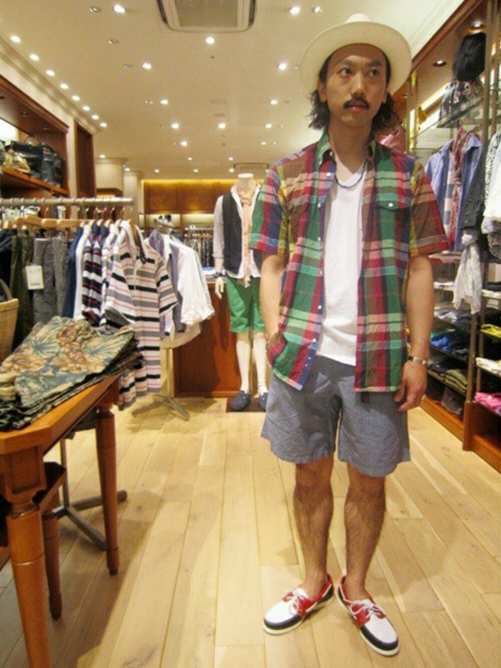 こんにちは。福岡はすでに梅雨入りして蒸し暑い日々が続いております。 そこで今回は王道の半袖×ショーツスタイルをご提案します! 色鮮やかなマドラスチェックのシャツはやや着丈も長めでショーツとの相性は◎!シューズはカラーリングをトップスに合わせたデッキシューズで統一感を出しました。 ビーズのアクセやパナマハットでリゾート感もプラス! これからの夏を楽しんでいきましょう~!
