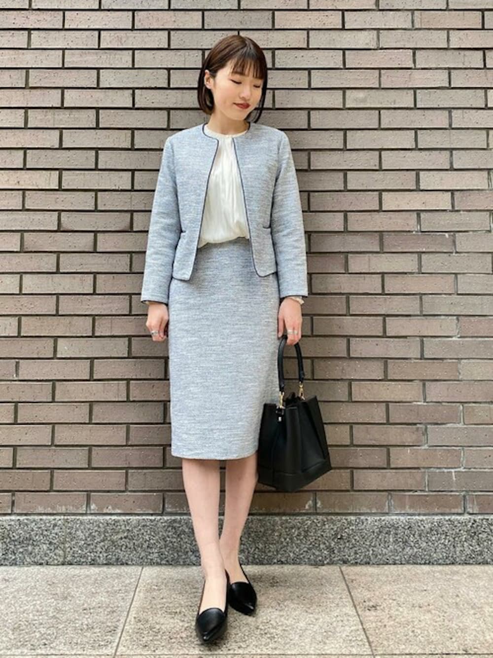 ツイードのセットアップを使ったきれいめコーデ ________________________ 身長:160cm / 普段サイズ:34or36 ◆ジャケット 【着用サイズ】36 【サイズ感】 程よくゆとりのあるサイズ感 短めの着丈なのでスタイルアップ効果ありです(^^) 【素材感・着心地】 コットンポリエステル素材のツイード 裏地がしっかり付いているので袖通しも◎ ◆ブラウス 【着用サイズ】ONE SIZE 【サイズ感】 ゆとりのあるサイズ感 長すぎない着丈で、インしてもアウトでもバランス良く 着用いただけます 【素材感・着心地】 薄手でさらりとした肌触り サテンの様な光沢感とたっぷりギャザーで女性らしい一枚 白だと透け感があるので、インナーは同系色がおすすめです ◆スカート 【着用サイズ】36 【サイズ感】 ウエストはほぼジャストサイズ ヒップから下にストンと落ちるシルエットなので、膨張せず すっきり見えするタイトスカートです 【素材感・着心地】 コットンポリエステル素材のツイードスカート 長すぎない着丈なので足さばきも◎
