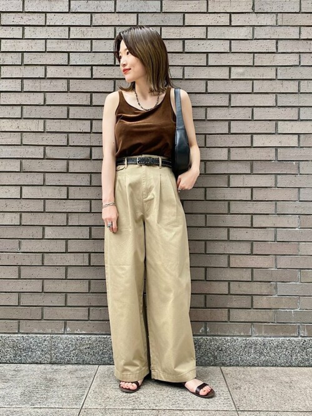 ____________________ ▼Instagramも更新してます▼ @hnc__ships 新作商品の紹介はもちろん、セールやクーポンなどの お得な情報も発信してます! ぜひご覧くださいませ(^^)? ____________________ 身長:160cm / 普段サイズ:34or36 ◆タンクトップ 【着用サイズ】ONE SIZE 【サイズ感】 程よくゆとりのあるサイズ感で、 肩紐細めで華奢な印象。 一枚で着ても、中にコンパクトなTシャツを着て ビスチェの様な着方も◎ 【素材感・着心地】 表地は少し起毛感のあるベロア生地、 裏地はサラッとしたポリエステル素材です 晩夏?秋冬にかけて、ジャケットのインナーや ワンピースなどのレイヤードに使える万能タンクトップです ◆チノパン BITBLUE 【着用サイズ】36 【サイズ感】 ウエストはほぼジャストサイズ 股上深めでハイウエストなチノパンです バルーンのような丸みのあるカーブシルエット。 【素材感・着心地】 やや地厚なコットン素材のチノパン 柔らかい肌触りで程よくハリ感があります ボリュームのあるシルエットなので、トップスは タックインしたり、コンパクトな丈感のものがおすすめです^^