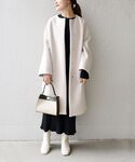 日常にもお仕事にも お上品なコートはマストバイ。 オフホワイトで女性らしく。 ------------------------------------------------------------------ 【着用レビュー 】 着用アイテム:ニット 身長:160cm / 普段サイズ:36 / 着用サイズ:38 サイズ感:普段よりワンサイズ上を着用。ボディラインを拾わず緩やかに着て頂けます。 素材感・着心地:上質なカシミヤ100%でストレス無く着心地抜群。 【着用レビュー 】 着用アイテム:パンツ 身長:160cm / 普段サイズ:34〜36 / 着用サイズ:36 サイズ感:全体的に余裕がありニットもすんなりイン出来ます。 素材感・着心地:ウールにポリエステルとレーヨンで温かさもあり、サラッとした穿き心地。 【着用レビュー 】 着用アイテム:アウター 身長:160cm / 普段サイズ:36 / 着用サイズ:36 サイズ感:ジャストサイズ。オーバーサイズですが着膨れることなくスッキリ。厚手のニットも難なく着て頂けます。 素材感・着心地:ボリュームの割にとても軽く動きやすさがあります。スーパー140の上質ウールでしっとり滑らかな肌触り。 ------------------------------------------------------------------